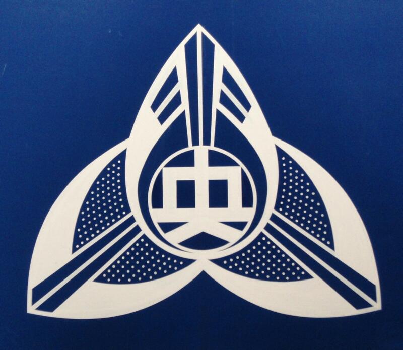 | 〈由来〉 1.3枚の桜の葉は、3校(敦賀西小・松原小・粟野小)の 児童が中央小に転入学し、寄り集まって、新設校が開校したことを表す。 2.3枚の葉を重ねた形は、融合と和を協調。 3.葉の中心の鉾先が三方に伸びているのは、中央小の躍進を表す。 4.葉の中心の点々は、「白砂青松」を表す。 |