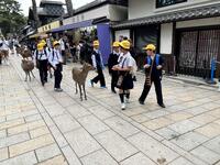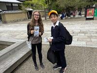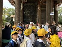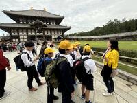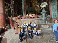 最初の見学地は奈良の東大寺です。ガイドさんに案内していただき、金剛力士像、大仏殿そして大仏を見学しました。社会科の学習で勉強してはいたものの、そのスケールの大きさに驚きました。さすが世界遺産です。見学後はふるさと東浦PRのため、授業で作成した紹介パンフレットを配る活動をしました。多くの方に興味を持っていただき嬉しかったです。外国の方には、英語を使ったPRに挑戦しました。