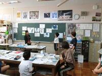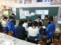 休憩時間には、展示物の見学をしました。写生画や工作、国語で作ったパンフレットや、地域の方に教えていただいた己書など、授業で制作した各自の力作に見入っていました。