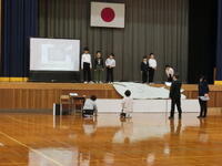 後半は地域の方によるふれあいフェスタ。市の担当の方による防災教室です。防災食づくりを体験した後、新聞紙のスリッパを作ったり、毛布の担架や段ボールベッドの組み立てを体験したりしました。災害時に対する意識を高めることができました。