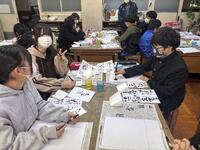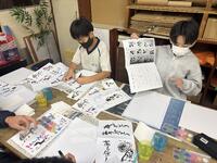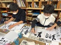 地域にお住まいの己書講師に来ていただき、己書を楽しみました。自分の好きな文字や言葉を、筆ペンでぐるぐる」や「漢字を大きく」、「逆書き」などさまざまな技法で表現しました。最後はパステルを使って、色鮮やかな作品に仕上げていました。素晴らしい芸術に触れることができたひとときでした。