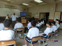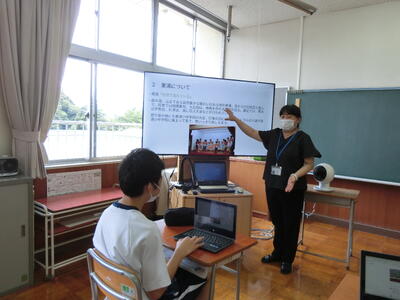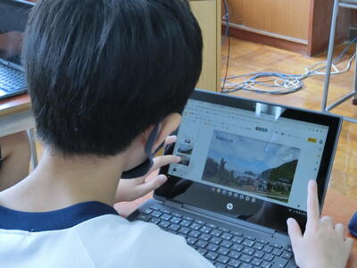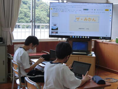 中学校1年生が企画している「東大みかん愛好会」との交流に向けて、準備が進んでいます。7月1日(金)総合的な学習の時間に、教室と校長室をつないで、Zoomプレゼンの練習をしました。