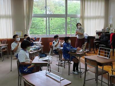 小学3、4年生は音楽の授業。「リズムで仲良くなろう」というテーマで、2つのグループに分かれてかけ合いをしてリズムに親しみました。