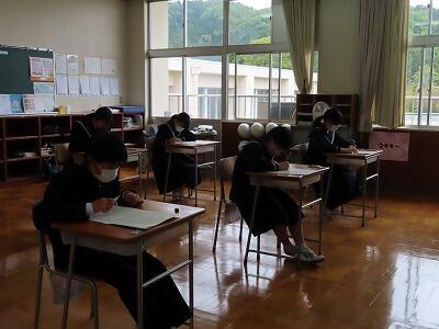 中学3年生は、今年度1回目の確認テスト。2年生までの学習内容の問題に真剣に取り組んでいました。