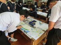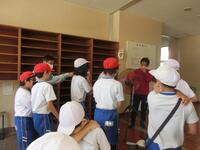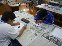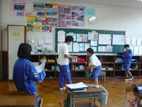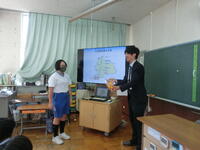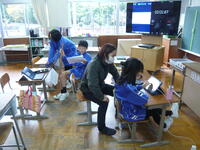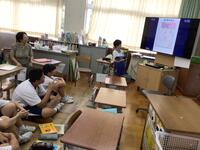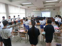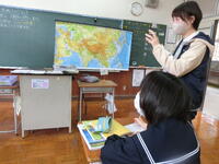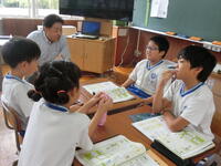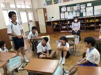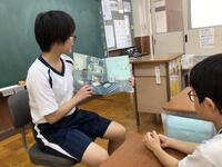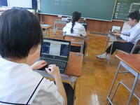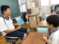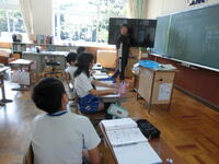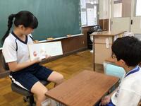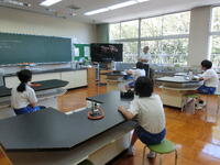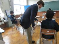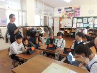 ローマ字の学習を終えた小学校3年生が、タブレットのローマ字入力の練習を始めていました。ICT専門の先生にもついていただいて、とても意欲的に取り組んでいました。小学校4年生は、算数の「面積」の学習で、新聞紙を使って「1平方メートル」を作っていました。1メートル物差しを駆使しながら、広い教室で伸び伸びと活動していました。中学2年生は、ALTの先生と新しい構文の練習をしていました。人気キャラクターを使っての会話で、大盛り上がりしながら取り組んでいました。