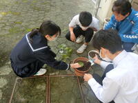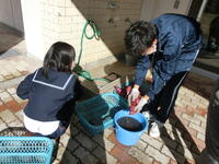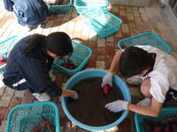 中学2年生が、11月23日(木)のふれあいフェスタで焼き芋にするサツマイモの水洗いをしました。バケツとたらいに水を張り、小学生が育てて収穫したサツマイモを、一つ一つ丁寧に、軍手をはめた手でやさしく洗って土を落としていきました。きれいになったサツマイモは紫色に輝いて、とてもおいしそうです。明日は小学生が、一つ一つをアルミホイルに包んで準備完了です。普段は、何気なく食べている焼き芋ですが、食べられるようにするまでに、様々な工程があることを学習しています。