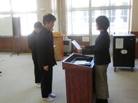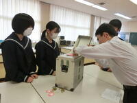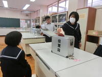 令和5年度後期の生徒会役員選挙を行いました。立候補者の演説のあと、敦賀市選挙管理委員会からお借りした本物の「投票箱」と「投票用紙」を使って、本番さながらに行うことの説明が本校の選挙管理委員からあり、みんな真剣な面持ちで投票を行っていました。立候補者の演説、司会者の進行、選挙管理委員の運営、生徒の投票、みんながそれぞれの立場で、緊張感をもって一生懸命に取り組んでいました。実際の選挙の練習にもなったようです。結果は明日、全校に報告されます。