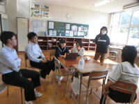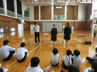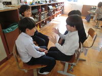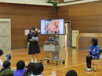中学3年生の家庭科の授業の一環で、小学1年生に「読み聞かせ」をしました。発達段階を勉強し、興味を持ってもらえそうな絵本を選んで音読の練習をして、1年生の児童を前に披露しました。1年生からも、国語の授業で作った言葉さがしのクイズを出題しました。中学3年生は、小学1年生のかわいらしさと素直さに触れて童心に帰り、小学1年生は大きなお兄さんお姉さんに絵本をたくさん読んでもらって「とっても楽しかった」と喜んでいました。校内で気軽に小中交流ができるのも、小規模小中併設校の本校ならではです。