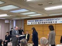 福井県歯科医師会が主催する「健康な歯をつくる県民のつどい」第30回福井県歯科保健大会の授賞式が行われ、本校の取り組みが、「優秀賞」をいただきました。昨年度の「最優秀賞」に続いて2年連続の入賞となりました。本校では、毎年全校児童対象に歯みがき教室を開催しており、給食後も毎回歯みがきをしています。ご家庭のご協力もあって、う歯の治癒率は100%となっています。子どもたちが健康な歯でよく噛んでおいしく食事ができるように、そして健康な生活を送っていけるように、これからも歯みがき活動に取り組んでいきます。