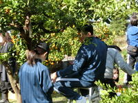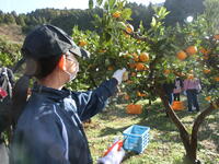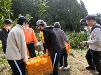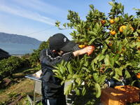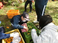 午前中に校区内のみかん園で、収穫作業を行いました。残念ながら小学生はインフルエンザによる臨時休業中のため、中学生のみの作業となりました。みかん園の方から、「みかんが腐らないように水分をしっかり拭き取ること」「みかんが割れないようにコンテナに丁寧に入れること」「みかん同士傷つけ合わないようにヘタをしっかり切り取ること」などの確認があったあと、いっせいに作業に取りかかりました。少ない人数で効率よく作業しようと、収穫する人、水分をタオルで拭き取る人に分かれて作業する姿が見られました。一度に3,4個のみかんを枝から切り取り、片方の手のひらで抱えながらヘタを根こそぎカットする姿、脚立に登り背の届かないところまで収穫するする姿もありました。「9年やってるもんなぁ・・・」と中学3年生。作業の効率のよさは、職人技のようです。途中休憩では、収穫したみかんの甘酸っぱさを味わいつつ、約1時間の作業で、20kgのコンテナ10箱以上を収穫しました。久しぶりに広がった晩秋の青空の下、「小学生の分まで!」という思いでがんばった中学生です。帰りには、袋いっぱいにみかんをいただきました。お世話になったみかん園のみなさま、ありがとうございました。
