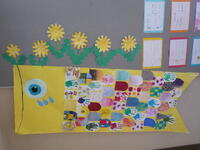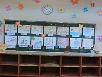 GW前に5・6年生が制作した大きな鯉のぼり。ぼかしやにじみを入れたり、スパッタリングの技術を使ってふんわりとした色あいの濃淡を表現したり、写真やモールを貼ったり、様々なアイデアで、一人一人が思い思いに作ったうろこをまとった鯉のぼりです。GW明けの学校に、色鮮やかな鯉のぼりが泳ぎ、子どもたちの元気な声が響いていました。