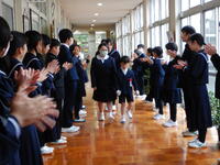 その後に行った離任式では、転任される4名の先生方から心のこもったお別れのメッセージをいただき、子どもたも別れを惜しんでいました。