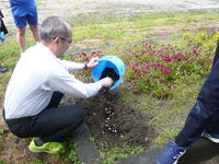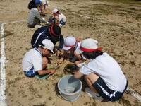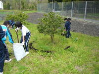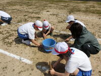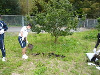 総合的な学習の時間に、校庭のみかんの木の肥料やりをしました。みかんの肥料は、春肥、夏肥、秋肥と2~3回に分けて与えます。春肥は、春枝の充実と幼果の肥大を促進させるのが目的です。また、木は太い根からではなく、細い根から養分を多く吸収するため、中心から少し離れたドーナツ状にまきました。昨年は裏年だったので、今年はたくさんおいしいみかんが育つよう、心を込めて作業していました。