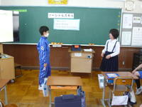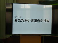 「あたたかい言葉のかけ方」をテーマに、友だちが困っている場面で声をかけるとしたら、どんな言葉がよいか考えました。一人一人が考えた言葉を、友だち役と声かけ役に分かれて発表しあいました。活動後の振り返りでは、「あたたかい言葉をいっぱいかけることができてよかった。」や「あたたかい言葉をかけると自分もうれしくなる。」など、言葉の持っている力について感じとっている様子がありました。
