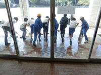 ←収穫後、畑の土で汚れた体育館玄関をデッキブラシできれいにしました