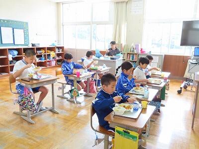 今日の給食は、みんなに大人気のポークカレー、フルーツカクテル、牛乳でした。どの学級でも、みんな笑顔で、おいしそうに食べていました。
