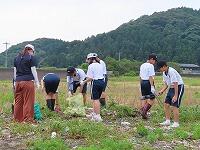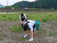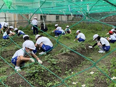 裏の畑に植えたサツマイモの苗がすくすく育っています。小学生全員で畑の草むしりを行いました。秋には大きなサツマイモが採れることを願いながら熱心に作業を進めました。
