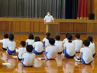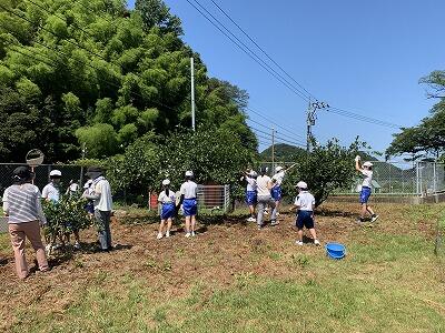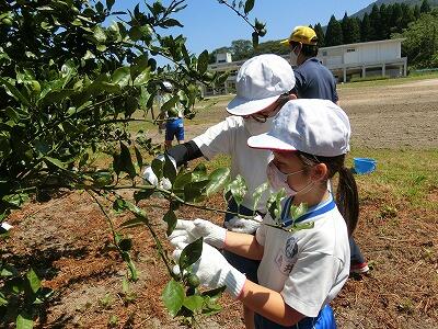 小学生が、校庭のみかんの摘果作業を行いました。1・2年生にとっては初めての作業でしたが、実際に作業をすることにより、秋の収穫がより楽しみになりました。