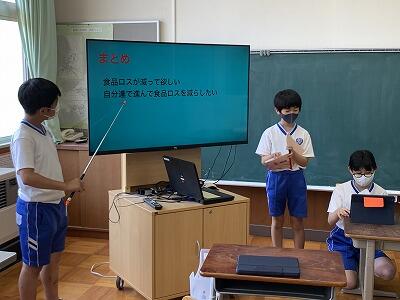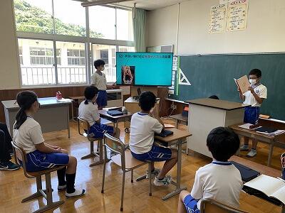 小学5・6年生が、国語の授業でタブレットを活用してプレゼンテーションを行いました。5年生は「ユニバーサルデザイン」、6年生は「環境問題」について調べたことをもとに、自分たちにできることを提案しました。タブレットを使っての資料(スライド)づくりに挑戦し、話すスピードや声の大きさ、間のとり方を工夫して発表することができました。