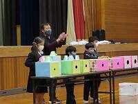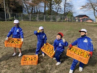小学1・2年生が、校庭のみかんを収穫しました。今年は豊作で、黄色く色づいたみかんがたくさん穫れました。4人は、みかんが入った重い箱を持って満足そうです。