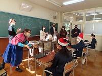 市内の中学校に勤務するALT6人がやって来ました。英語の授業でクリスマスに関する質問に答えたり、クリスマスソングを歌ったりしました。一足早くクリスマスの雰囲気を味わい、楽しい時間を過ごすことができました。