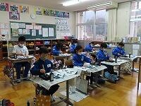 中学1年生の家庭科の授業で、トートバッグを製作しています。各自が布の柄を選び、仮縫い、ミシン縫いを進めています。どの生徒も真剣に作業に取り組んでいます。完成が楽しみです。