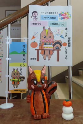 あいさつ運動のキャラクター「あいりす」の誕生祭について、生徒会から次のような連絡がありました。「あいりすの好きなことは挨拶をすることです。この1カ月は、あいりすのために、今までよりもさらに明るく元気な挨拶を、自分から、誰とでも交わして、みんなであいりすの誕生を祝いましょう!」