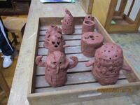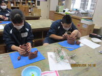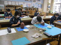 中学2・3年生が、粘土で陶灯り(とうあかり)の制作をしています。ドーナツ型にこねた粘土を積み上げ、筒状に整えて、抜き型やストロー、ポンチ等で穴をあけるとできあがりです。しっかり乾燥させてから学校窯で焼き上げます。作品の仕上がりが楽しみです。
