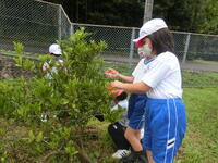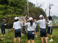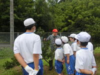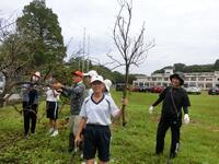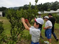 地域の方に講師としてお越しいただき、全校で校庭のみかんの木の摘果と剪定をしました。今週の火曜日、地域のみかん園で摘果作業を行ったばかりなので、みかん園と校庭のみかんの違いにたくさん気づき、講師の先生にさかんに質問をしていました。商品として売り出すためのみかんと、子どもたちの学びのために育てているみかん、目的が違うのですが、子どもたちは校庭のみかんも観光みかん園のように美しい実に育てたいと感じたようです。今年は、継続的に講師の先生に来ていただいて、子どもたちの持つ疑問や思いに応え、主体的な学びとなるように進めていきます。