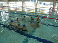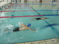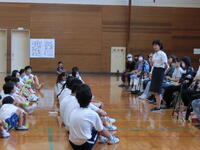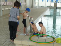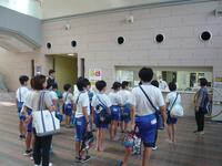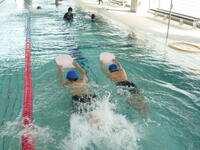 敦賀市運動公園プールで水泳学習を行いました。泳力に応じて2グループに分かれ、水に顔をつけることから、けのびやビート板を使ってのふしうきと、段階を追って練習しました。2回の休憩をはさみ、合計で1時間余りの練習ができました。特に、最後の自由練習時間では、友だちと競争したり、水に沈めたダイブボールを潜って拾ったりして、水泳の楽しさを体得することができました。