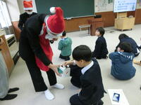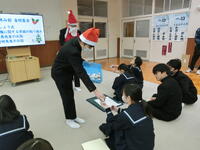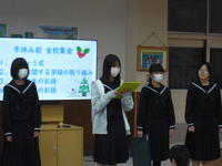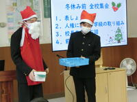 冬休み前の全校集会をしました。学習や運動、文化活動で活躍した人の表彰、人権週間の各学級の取り組みの報告、校長先生や生徒指導主事の先生からのお話などがありました。生徒会長と副会長がサンタ姿になって登場し、みんなに手作りのシャトル・マスコットをプレゼントして歩くというサプライズもありました。給食の時間には、小学校56年生が、学校畑で育てたさつまいもで作った「さつまいもプリン」を配り、思わぬクリスマス・プレゼントに大喜びの子どもたちでした。よくがんばった令和5年にふさわしい、よいしめくくりができましたね。病気やケガに気をつけて、お手伝いをたくさんして、楽しい冬休みを過ごしてください。令和6年1月9日(火)元気に会いましょう。今年1年、本校の教育活動に深いご理解と絶大なるご支援をいただきました保護者の皆様、地域の皆様、本当にありがとうございました。どうぞよいお年をお迎えください。