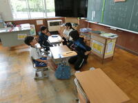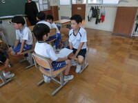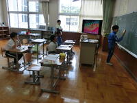 小学1年生の算数では、サイコロを使ったゲームで、数の構成の理解を深めていました。二人一組で1回ずつサイコロを振り、「7」ができれば大成功!