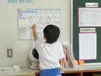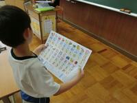1年生の教室に入ると「ねえねえ、これ全部読めるようになった!そり、とけい、ふゆ・・・」と言い、ひらがなで書かれた2文字と3文字の言葉を順番に読んでくれました。「すごいねぇ。ひらがなそんなに覚えたの。」と言うと、続いて教室後ろの掲示板へ。今度は、カタカナを五十音順にひとつずつ読み上げてくれました。「アイウエオ、カキクケコ・・・」「カタカナも覚えたの。すごいなぁ。」