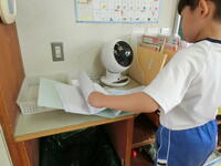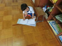 さらに今度は、目の前にあったひらがなプリントを綴ってあるファイルを取り出しました。「1,2,3,・・・」プリントを1枚ずつめくって数えはじめました。数えている途中に、これまでにめくったプリントが元に戻ってしまい、どこまで数えたかわからなくなりました。すると今度はファイルをロッカーの上に置き、途中で戻らないように手でしっかり押さえながら数え直しました。「1,2,3,・・・33。33枚!」「もうそんなに勉強したの。すごいなぁ。1年の終わりには何枚になるかな?」首をかしげながら「100万?」まだまだ続きます。今度は算数プリントのファイルを取り出し、枚数を数えはじめました。「1,2,3,・・・21」「両方で何枚?」「33と21で・・・1年生にそんな難しいこと聞かないで」「そうやな。まだ計算習ってないもんね。」すると、床にしゃがみ込み気合いを入れて、まずはひらがなプリントの枚数を数えはじめ、その続きから算数プリントの枚数を数えました。「1,2,3,・・・53,54,55。55枚!(1回目に数え漏れがあったことも発見できました)」見事に合計枚数を求めました。