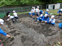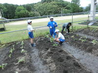 今年も6年生の「さつまいも先生」を中心に、紅はるかの苗を植えました。植え方は、「さつまいも先生」が調べて、水平植えと直立植えの2つの方法で植えました。大きいいもと小さいいもがバランスよく育つように工夫したそうです。秋の収穫が楽しみです。