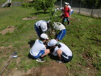 地元のみかん農家の方のご指導のもと、校庭にみかんの苗を植えました。穴を掘り、水を入れ、苗木を置き、土をかぶせました。風や雪などの厳しい天候に耐えられるよう竹で支えをつくったり、虫がつかないようにネットで覆いをしたりと、よく育つよう工夫をしました。みなさんが心を込めて植えたみかんが、大きく美味しく育ちますように!
