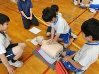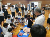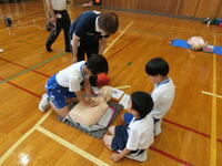2限目に日本赤十字社福井県支部より2名の指導員の方をお招きして、全校児童生徒と教職員、参加を希望された保護者の方を対象に救命救急処置講習会を実施しました。心臓マッサージ、人工呼吸、AEDの使い方を班に分かれて実際に体験しました。また、自分の命は自分で守ることの大切さや日頃から危ない箇所などを見つけたらすぐに知らせることの重要性についてもお話がありました。人を助けるのはそう簡単にできることではありませんが、そのような場面に出会ったときに、今日の学びが活かされると同時に、まずは大声で近くの人に助けを呼べる子どもたちであってほしいと思います。