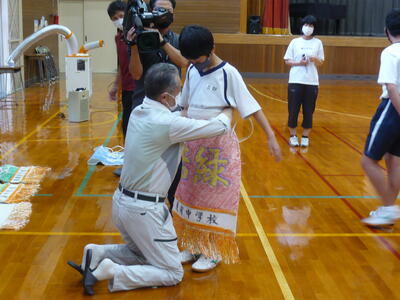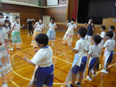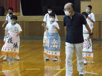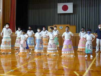 東浦中学校の先輩が手作りした化粧まわしを着け、甚句に合わせて踊る練習をしました。