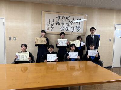 その中から書道の部に6名、作文の部に2名が入賞し、今日、敦賀税務署長さんが、賞状と副賞を届けてくださいました。