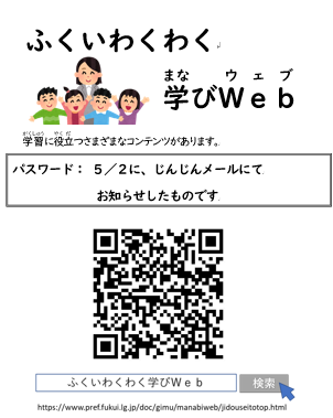 「ふくいわくわく学びweb」は、ネット上で、「ふくいわくわく学びweb」と検索していただくか、QRコードを読み込んでいただいてパスワードを入力してもらえれば、閲覧することができます。(パスワードは5月2日配信の学校からのじんじんメールにてお知らせしたものです。)