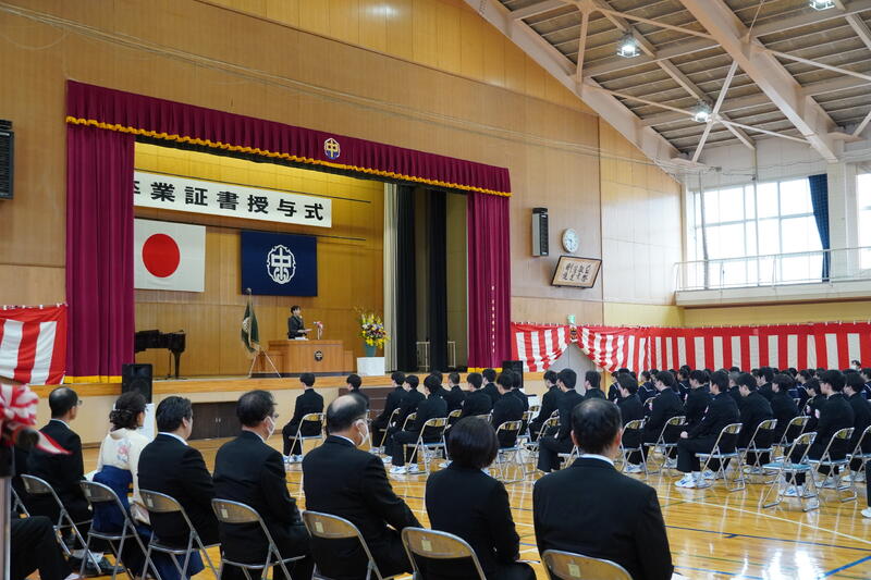 今年度は5年ぶりに全校生徒が一堂に集まっての式となり、静粛な雰囲気での凜とした空気の中、担任の呼名とその返事、校長の式辞とPTA会長様からの祝辞、送辞・答辞の流れる声とそれにあわせる歌声が体育館中に響き渡りました。