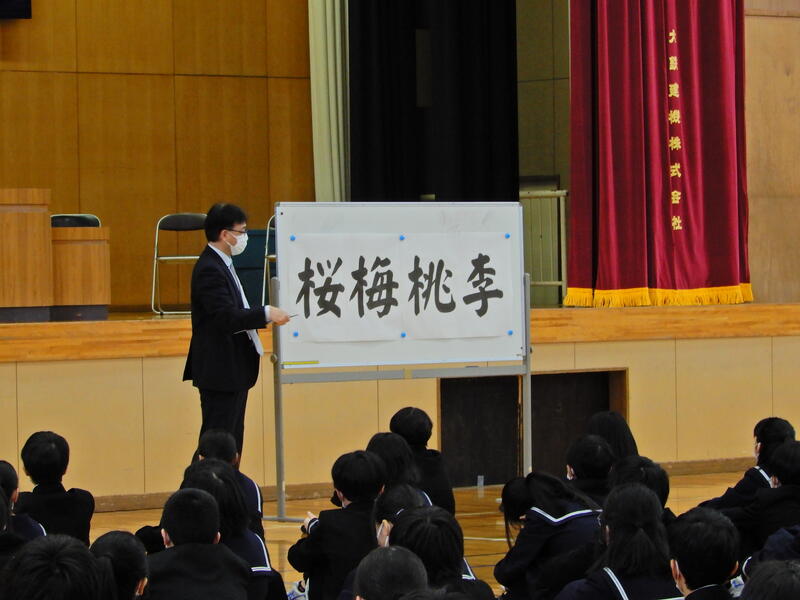 終業式・修了式では、今年度1年の振り返りと春休み後の新しい生活に向けて、校長先生と生徒指導より話がありました。校長先生からは、この春休みを次年度に向けてのウォーミングアップをする時間とし、学習面や生活面で準備をしてほしいと話がありました。生徒指導からは、「桜梅桃李」という言葉の紹介があり、この言葉のように、それぞれが得意なことでいろんな場面で活躍していける次年度にしようと話がありました。