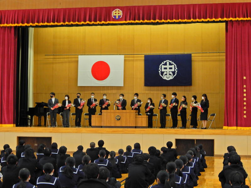 離任式・退任式では、転任・退職される17名の先生方と調理員の方に、生徒会長より感謝の言葉と、執行部より花束の贈呈がありました。先生方からいただいた励ましの言葉を胸に、新しい気比中を盛り上げていきたいです。