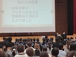 5月30日(火)の5限目に、1・2年生合同でふるさと講演会が行われました。講師に本勝寺住職の桃井泰人氏をお招きし、桃井氏が代表を務めていらっしゃる「角鹿会(かくろくかい)」の取り組みや敦賀の歴史についてのお話をいただきました。