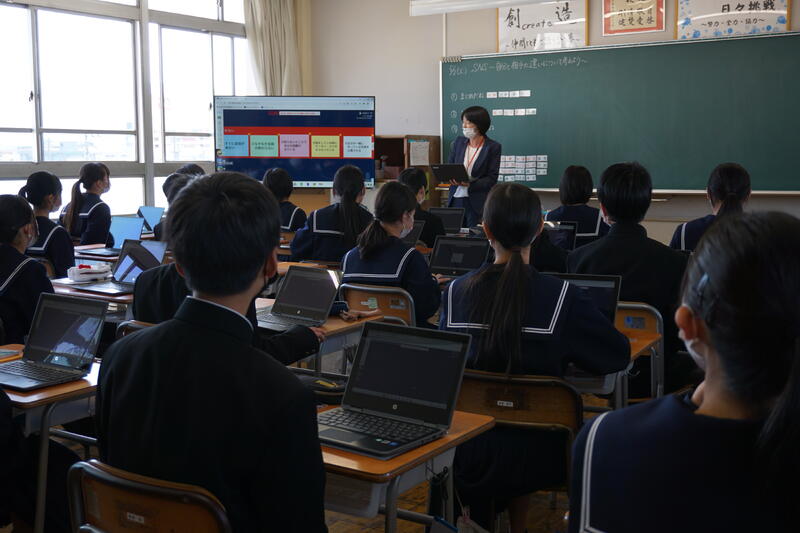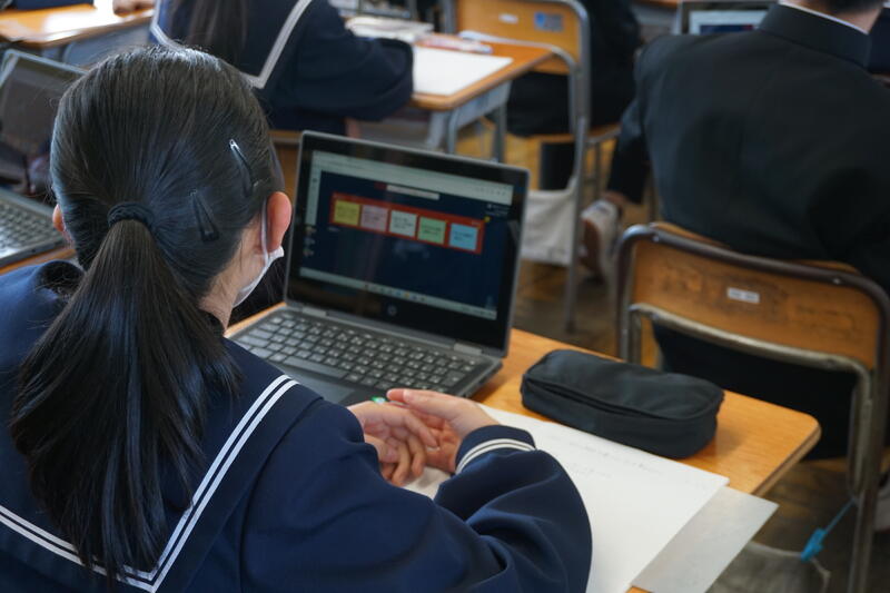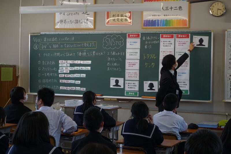 まず、教科書に掲載されている「いじめに立ち向かう君に」という題材を読んだあとで、クラスの仲間から言われて1番不快に感じることについての投票を行いました。次にタブレットでロイロノートを開き、5つのカードに書いてある項目において、許せない順番に並び替え、それをクラス全体で共有しました。この活動を通して、自分と仲のいい友達やクラスメイトが嫌だと感じることには、違いがあるということに気づくことができました。また、自分と相手との考え方や感じ方の違いから、今後起こりうるトラブルを考え、SNSでのトラブルを起こさないためにはどうしていくのかについて、一人ひとりの決意を発表し合いました。
