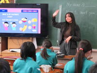 5、6年生が、外国語の授業で新しいALTとコーディネーターの先生の自己紹介を聞いたり、質問をしたりしました。