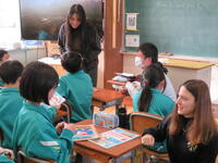 まず、1年生の教室で、国語の授業でカタカナの練習をする様子を見てもらいました。
