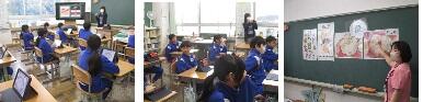 1つ目は、「だしの学習」の後です。5年生は、先日、栄養教諭から、だしのうま味を学ぶ実習を受けました。次は、自分たちで実際にだしをとったみそ汁を作る調理実習を計画します。今日は、だしの取り方やみそ汁の作り方を、動画で確認するところから始めました。「何分水につけておくんだっけ?」、「なぜはらわたを取るんだっけ?」、「あくをとるのはどうしてだっけ?」と、動画を止めながら質問すると、先日の知識をよく覚えており、即答していました。頭の中では、うまくいきそうです。最後に、班ごとに調理の手順をタブレットに入力しながら確認しました。だし香るおいしいみそ汁を作りましょう!