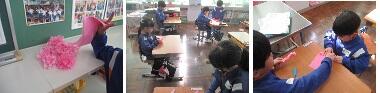 昨日も今日も、お昼の放送では、ありがとうプロジェクト実行委員の5年生より、6年生に向けた楽しみにしていてほしいとのメッセージや準備のときの在校生の気持ちなどが紹介されていました。よい放送だと思いました。各学年ともステージ練習を繰り返していますし、4年生はプレゼントのメッセージ色紙を、1年生は似顔絵の周囲を飾るお花紙の準備をしていました。(3年生は看板、2年生は飾り担当のようです。)晴れの舞台は、こうした裏方の準備に支えられているのですね。