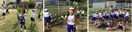 今週水曜日に2年生は、里芋掘りをしました。大きく育った葉っぱの根元を掘ると、しっかりと里芋ができていました。